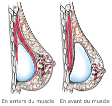 La prothèse peut être placée en avant ou en arrière du muscle pectoral :