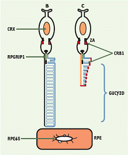 On estime que 10 % des enfants atteints par l'amaurose congénitale de Leber sont porteurs d'une mutation du gène RPE65. Le gène RPE65 code une protéine du même nom qui intervient dans la synthèse du pigment visuel (rhodopsine). Les patients ayant des mutations dans ce gène ont donc un déficit dans la synthèse du pigment visuel, et par conséquent ont des photorécepteurs qui réagissent très peu à la lumière. Il a été montré que chez la souris déficiente en RPE65, l'apport d'une forme artificielle d'un des composants de ce pigment visuel (le 9-cis-rétinal), permet de retrouver de la vision. Malheureusement ceci ne peut être envisagé chez l'homme pour l'instant car ce composant s'accumulerait et risquerait d'être préjudiciable à la rétine.