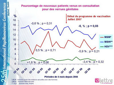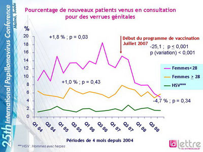 Une diminution significative de plus de 25% (RR = 0,52) du nombre de nouveaux cas de verrues génitales chez les jeunes filles de moins de 28 ans (jeunes femmes vaccinées) est observée dans les mois qui ont suivi la campagne de vaccination alors que l’incidence reste stable chez les femmes de 28 ans ou plus (non concernées par la vaccination) tout comme le nombre de nouveaux diagnostics d'Herpès génital qui étaient suivis en parallèle dans ce même centre en tant que pathologie référente.