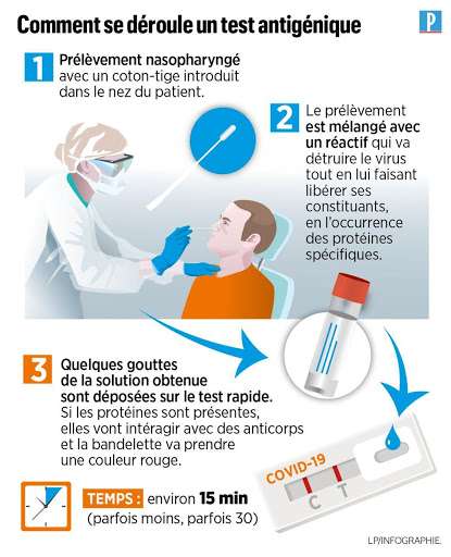 Le test antigénique est rapide alternatif à PCR, permet de détecter les protéines que produit le virus Sars-CoV-2, appelées "antigènes". Il cherche à déterminer si la personne est infectée par le virus au moment du test. Ce test est destiné à une orientation diagnostique. Il est réalisé à partir d’un prélèvement nasopharyngé. Il s’agit d’une technique rapide qui vise à détecter des protéines spécifiques du virus SARS-CoV-2 (ou antigènes), et non son ARN. S'il est plus rapide, c'est que ce test ne procède pas à des cycles d'amplification des molécules biologiques. Le prélèvement obtenu est déposé sur une bandelette contenant des anticorps capables de se fixer sur les antigènes recherchés.