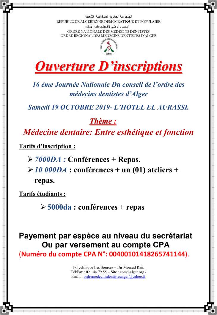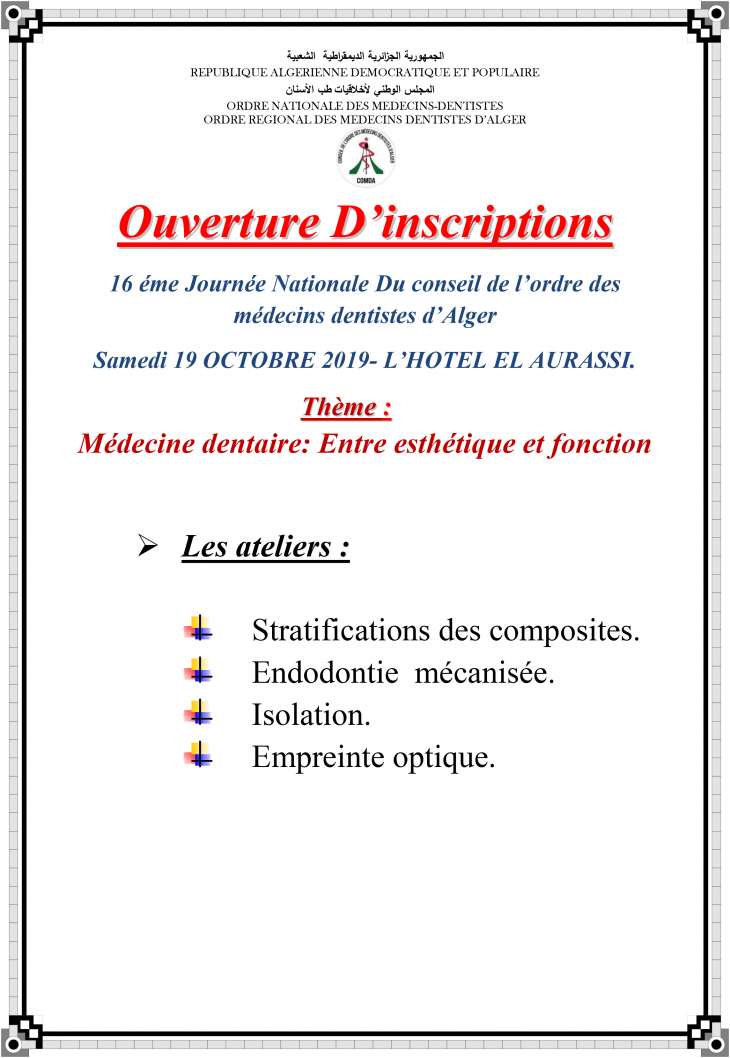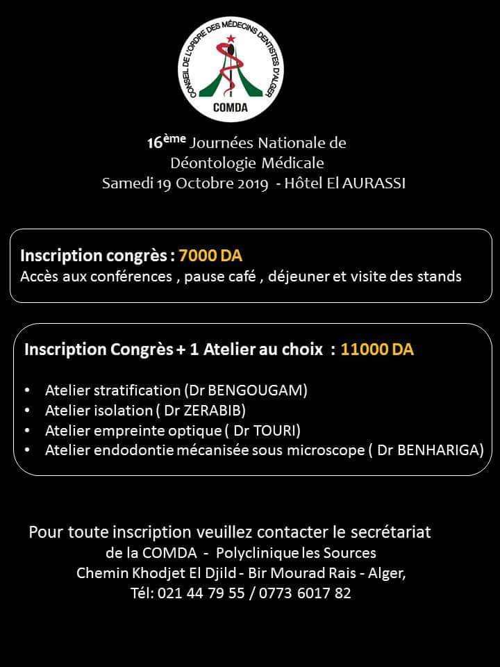 L'ordre des médecins dentiste d'Alger organise la 16eme journée nationale de Déontologie Médicale, le 19 octobre 2019 a l'hotel El Aurassi, Alger.