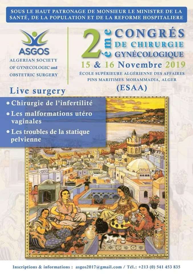 L’association Algérienne de chirurgie gynécologique et obstétrique ASGOS, organise son 2ème Congrès De Chirurgie Gynécologique, prévus pour les 15 et 16 Novembre 2019 à l'école supérieure des affaires Pins maritimes ESAA.
