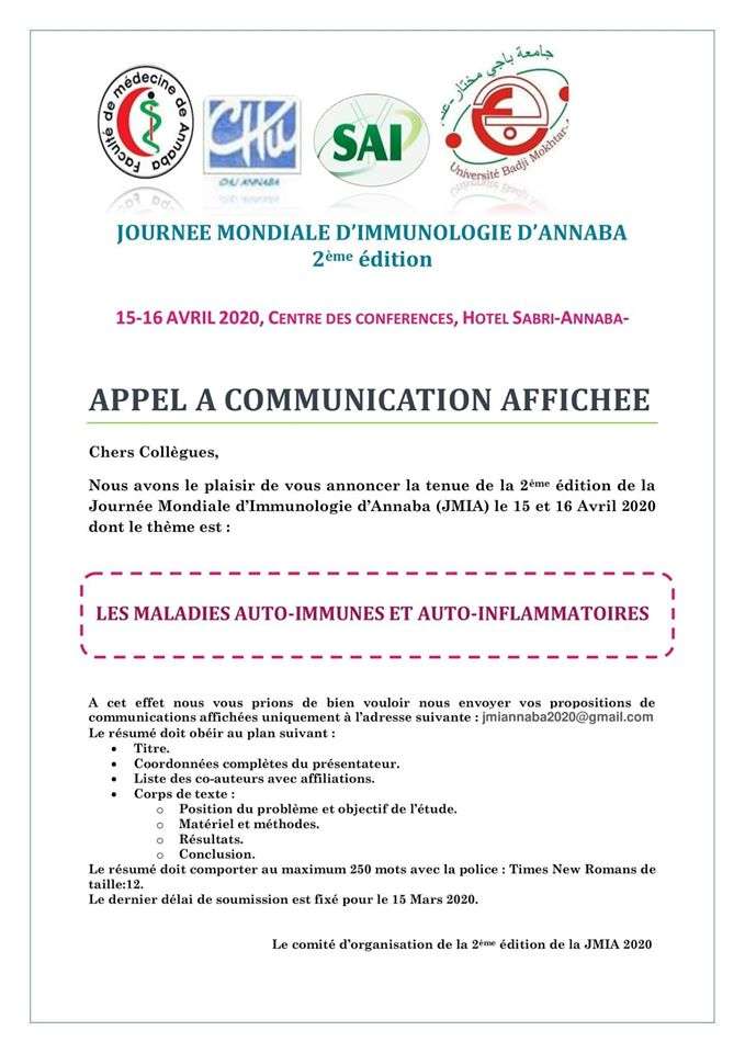 Journée mondiale dimmunologie dAnnaba- Les 15,16 avril 2020 -Annaba-