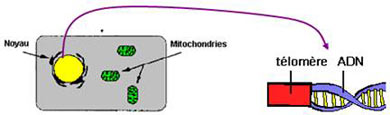 - Les télomères, placées à l’extrémité des chromosomes, sont produites durant le développement embryonnaire. Ce sont de courtes séquences d’ADN répétées plusieurs milliers de fois. Elles prolongent les chromosomes et leur assurent une protection contre les effets du temps et de l’environnement. Leur raccourcissement est un phénomène naturel qui témoigne de notre vieillissement au niveau cellulaire. A chaque cycle de division de la cellule (dont le nombre maximum oscille entre 60 et 100), la longueur de ces structures diminue. Ainsi, plus les télomères sont courts et plus la cellule est en fin de vie. On dit que les télomères constituent des horloges biologiques, car à chaque division cellulaire leur taille diminue. A force de se diviser, le télomère devient si court que la cellule ne pourra plus se diviser, elle mourra. A plus grande échelle, les tissus constitués par ces cellules et l’organisme tout entier témoignent de ce vieillissement.