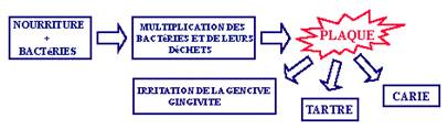 Après chaque repas des débris d'aliments se déposent sur la surface des dents ou entre les dents. Ces débris attirent les bactéries présentes dans la bouche et ensemble ils vont former la plaque dentaire. C’est une matière blanchâtre et pâteuse qui se dépose sur les dents. Si elle n'est pas nettoyée 2 fois par jour, elle devient un vrai repère pour les bactéries responsables des maladies dentaires comme la carie. En retenant les débris de nourriture, elle va fournir aux bactéries toute la nourriture dont elles ont besoin pour se développer. En ce développant les bactéries vont transformer l'équilibre de la bouche qui va devenir très acide. Une fois la plaque bactérienne installée, les déchets produits par les bactéries irriteront votre gencive qui essaiera tant bien que mal de se défendre, mais en vain. Vous seul pouvez, par de bonnes mesures d’hygiène, déloger la plaque et ainsi rendre la santé à vos gencives.La gingivite (inflammation de la gencive) est une maladie qui se prévient et se traite par de bonnes mesures d’hygiène. Si toutefois, vous la laissez progresser, elle peut rapidement évoluer vers la parodontite.
